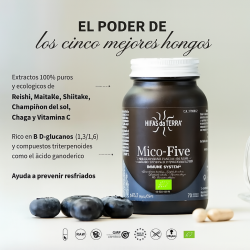 Mico-Five de Hifas da Terra en un suplemento alimenticio con extractos de Reishi, Maitake, Shiitake, Champiñón del sol y Chaga que estimula el sistema inmunológico, aumenta la energía y mejora el estado de salud en general.