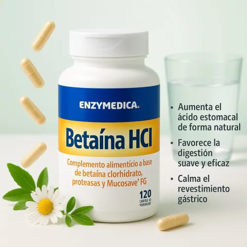 La Betaine HCI, derivada de alimentos como la remolacha, las espinacas y el trigo, es una forma complementaria de trimetilglicina que actúa en sinergia con otros componentes para optimizar el proceso digestivo. Su capacidad para equilibrar los niveles de ácido estomacal resulta clave para personas con problemas como indigestión, acidez o pesadez tras las comidas.