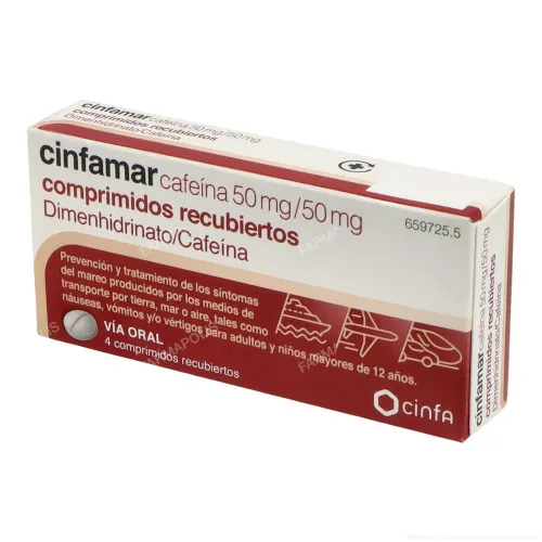 Son unos comprimidos que se toman para evitar el mareo y las nauseas causadas por los viajes. Se toman media hora antes de comenzar el viaje y si el viaje es muy largo se puede tomar otro comprimido a mitad del viaje. Valen para los mareos de los viajes, ya sean en autobús, barco o coche. El principio activo de los comprimidos de cinfamar provoca sueño, por lo que posee cafeína para contrarrestar este efecto. /p>
