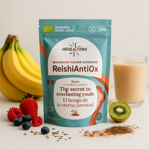Superalimento antioxidante y ecológico con polvo de Reishi, que contiene sustancias antioxidantes, antiinflamatorias y relajantes.